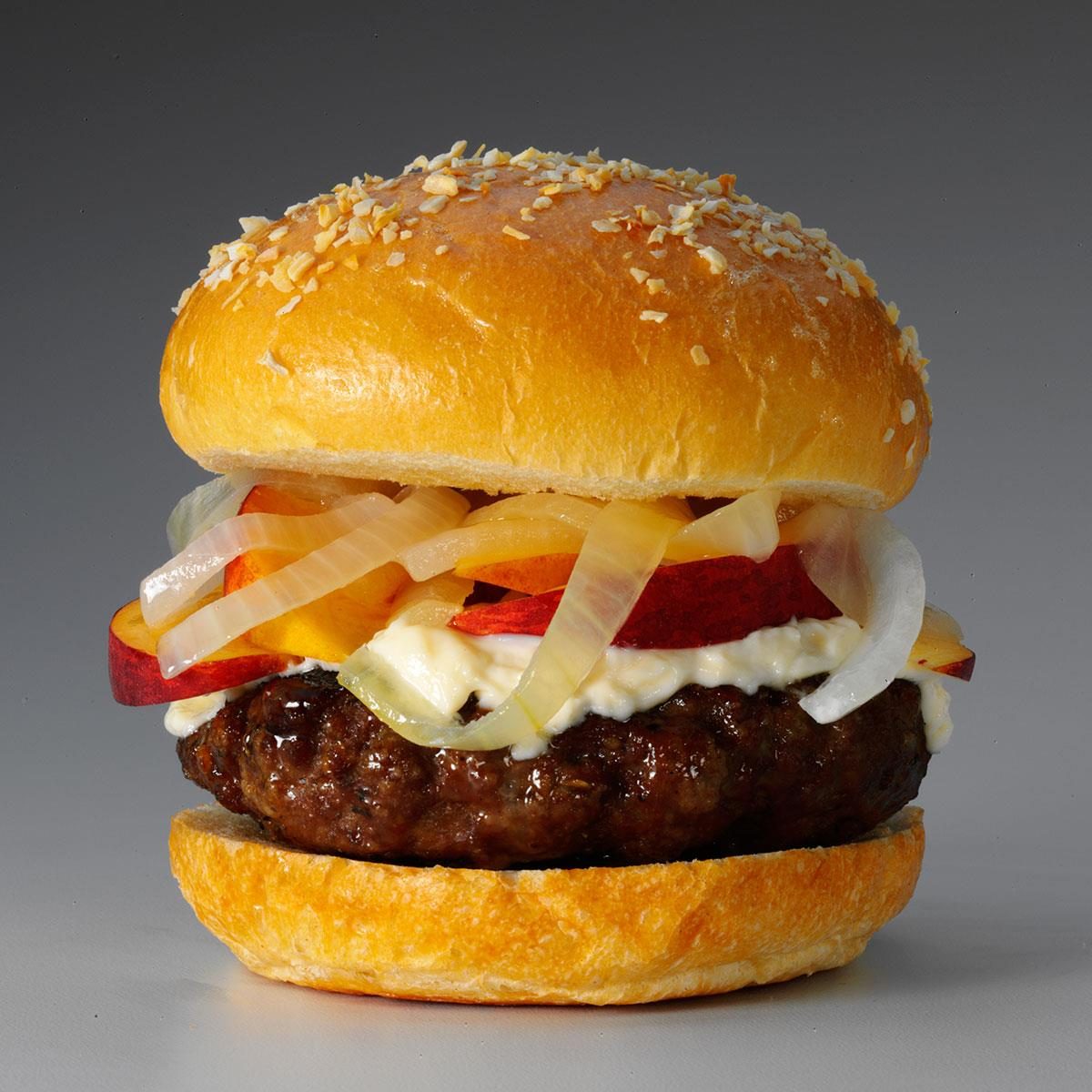 Take one all-American patty and load it up Georgia-style with mayo, fresh sliced peaches and sauteed Vidalia onions.