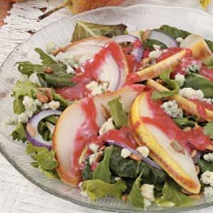Pear slices tossed with salad greens, red onion and blue cheese are drizzled with tangy raspberry vinaigrette in this refreshing...