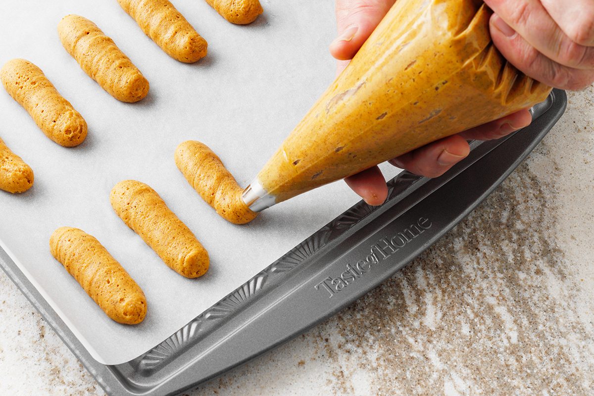 - Cut a 3/4-in. hole in the tip of a pastry bag. Working in batches, pipe dough to form 2-1/2-in. logs, 2 in. apart, onto parchment-lined baking sheets. Bake until cookies are golden and set, 12-14 minutes. Cool on a wire rack.