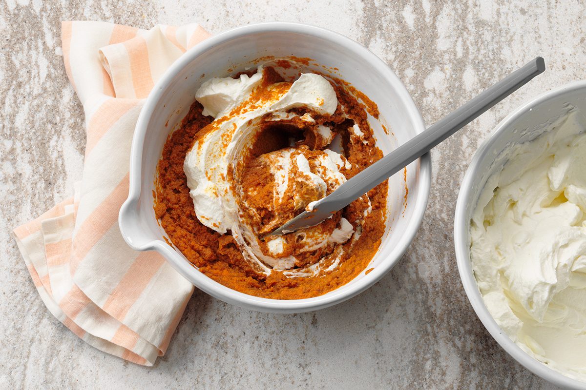 In another bowl, mix together the canned pumpkin and spices. Fold a third of the whipped cream into the pumpkin mixture. Be gentle while you fold so you don’t deflate the cream.